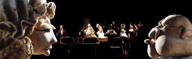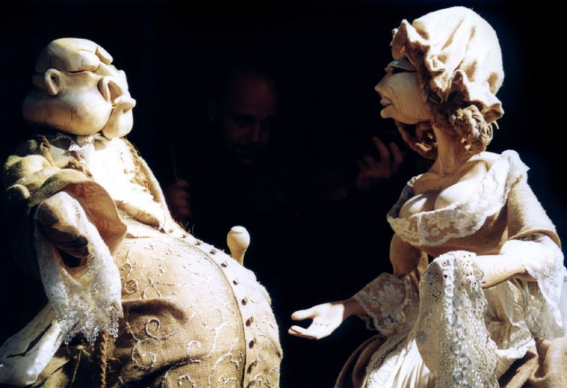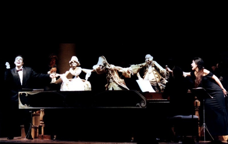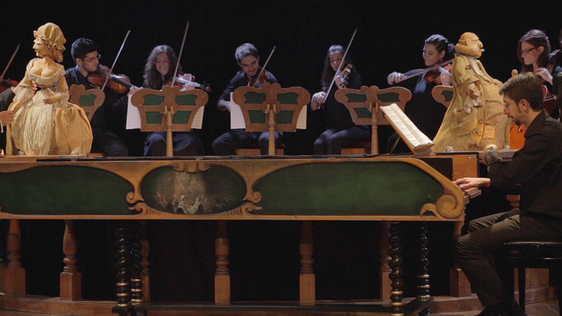 Etcétera’s treatment departs from traditional approaches to puppet operas, where puppets are the mere representation of characters. The opera’s various elements (instrumentalists, singers, actors, puppeteers, and puppets) allow for their interaction — transcending the ranges to which they belong. With Etcétera, the viewer is a participant in a framework that brings together eighteenth century puppeteers, who travel the world with their show, their puppets, and adopt an autonomy independent of the script, and embody, in turn, actors of a Commedia dell’Arte performance. This is combined with the musicians’ presence onstage. The director and the singers (of present day) who — to escape their traditional roles — at times are caught in comic situations with the puppets. The stage is set around the puppets who appear between the musicians (a soprano and a baritone together with a chamber orchestra encircling a clavichord).