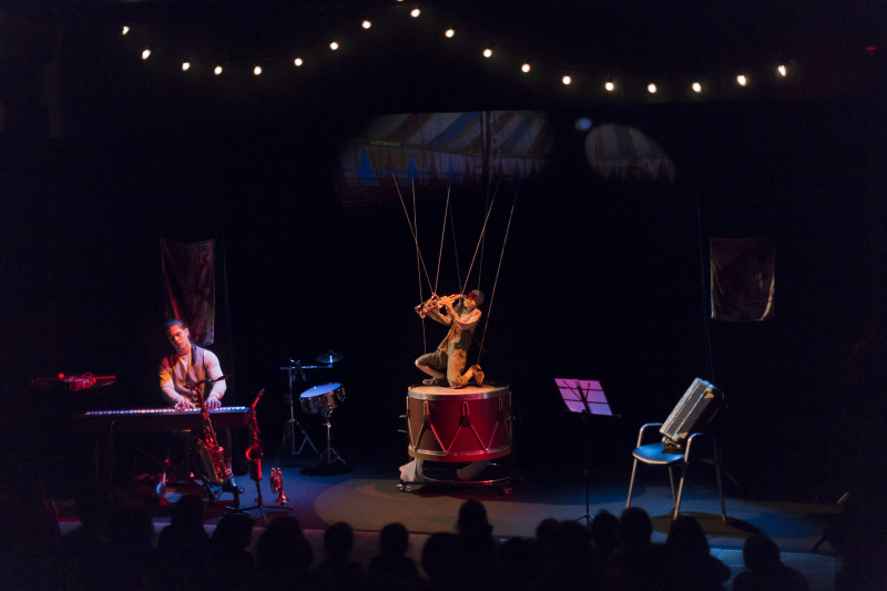 La puesta en escena combina los lenguajes musical y titiritero. La música, creada para esta obra, se interpreta en directo con varios instrumentos -fundamentalmente piano y saxofones- y es ella la que hila las relaciones entre los distintos personajes.
